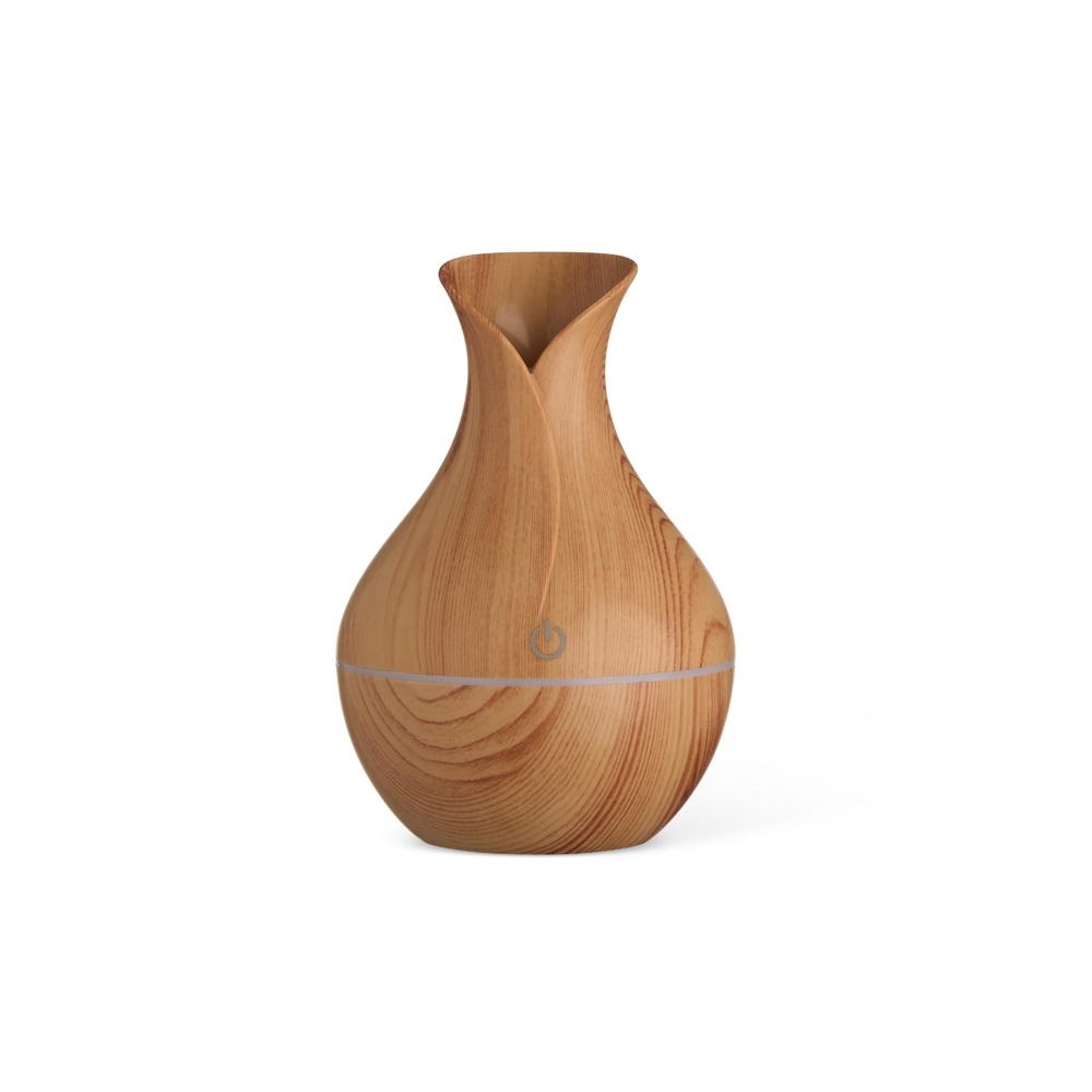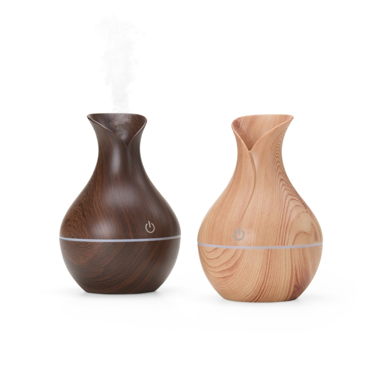 Descrição: Umidificador com led de 7 cores com exibição alternada. Produzido em plástico estilizado em madeira com acabamento brilhante. Umidificador possui capacidade de até 150ml e funciona apenas a base de água. Acompanha filtro de algodão e um cabo USB. Obs.: A limpeza externa deve ser feita apenas com pano umedecido, caso submergir o produto o equipamento pode ser danificado.