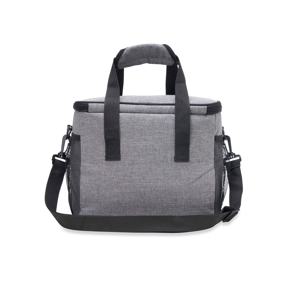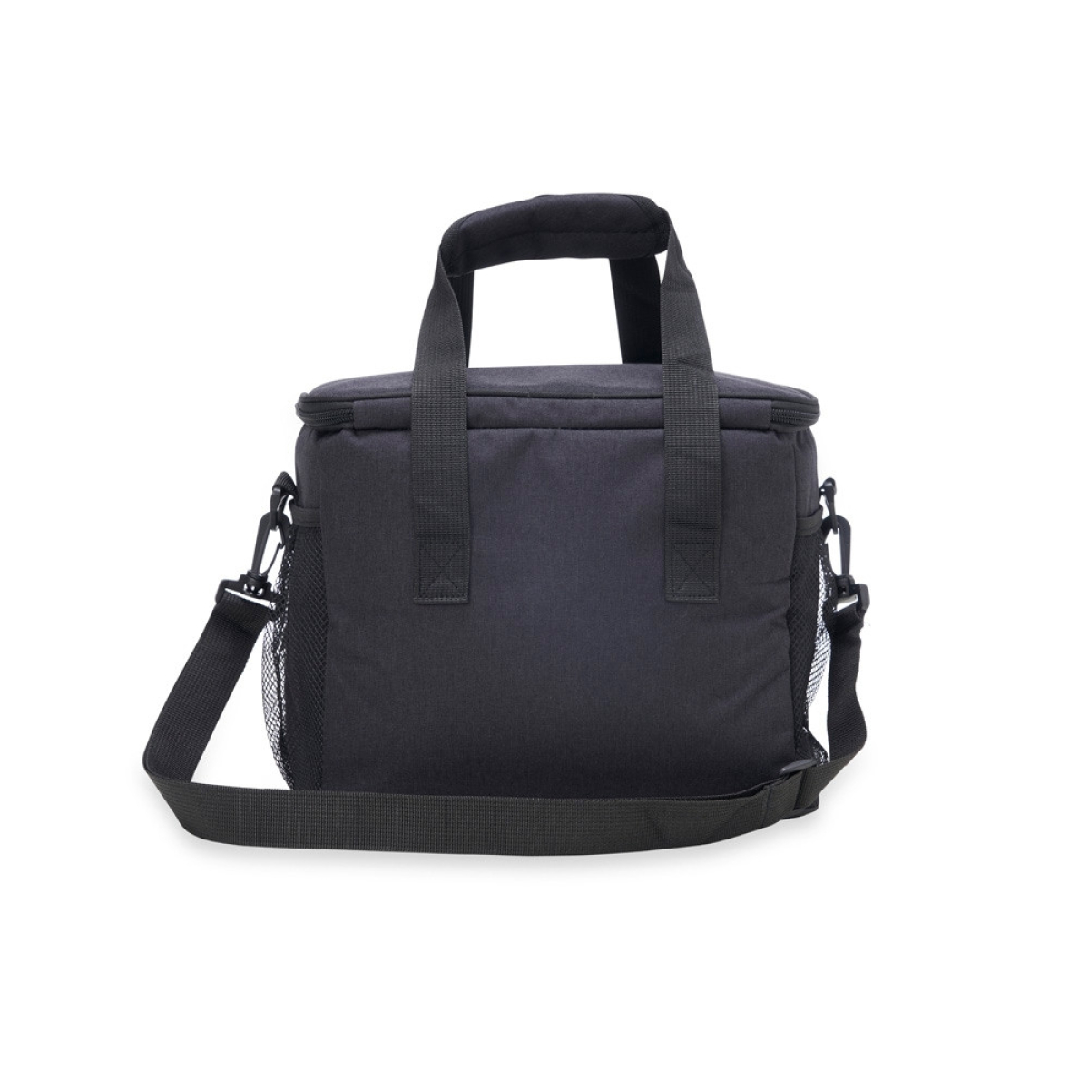 Descrição: Bolsa térmica de nylon 14 litros com bolso frontal e bolsos laterais em malha. Compartimento principal com revestimento térmico soldado antivazamento e alças de mãos com suporte de juntura. Acompanha alça transversal.