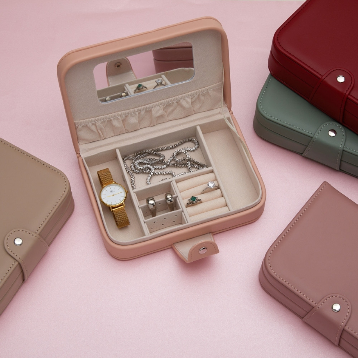 Descrição: Porta-joias em couro sintético com revestimento aveludado e espelho. Possui compartimentos internos para anéis, pulseiras, colares e placas para brincos.