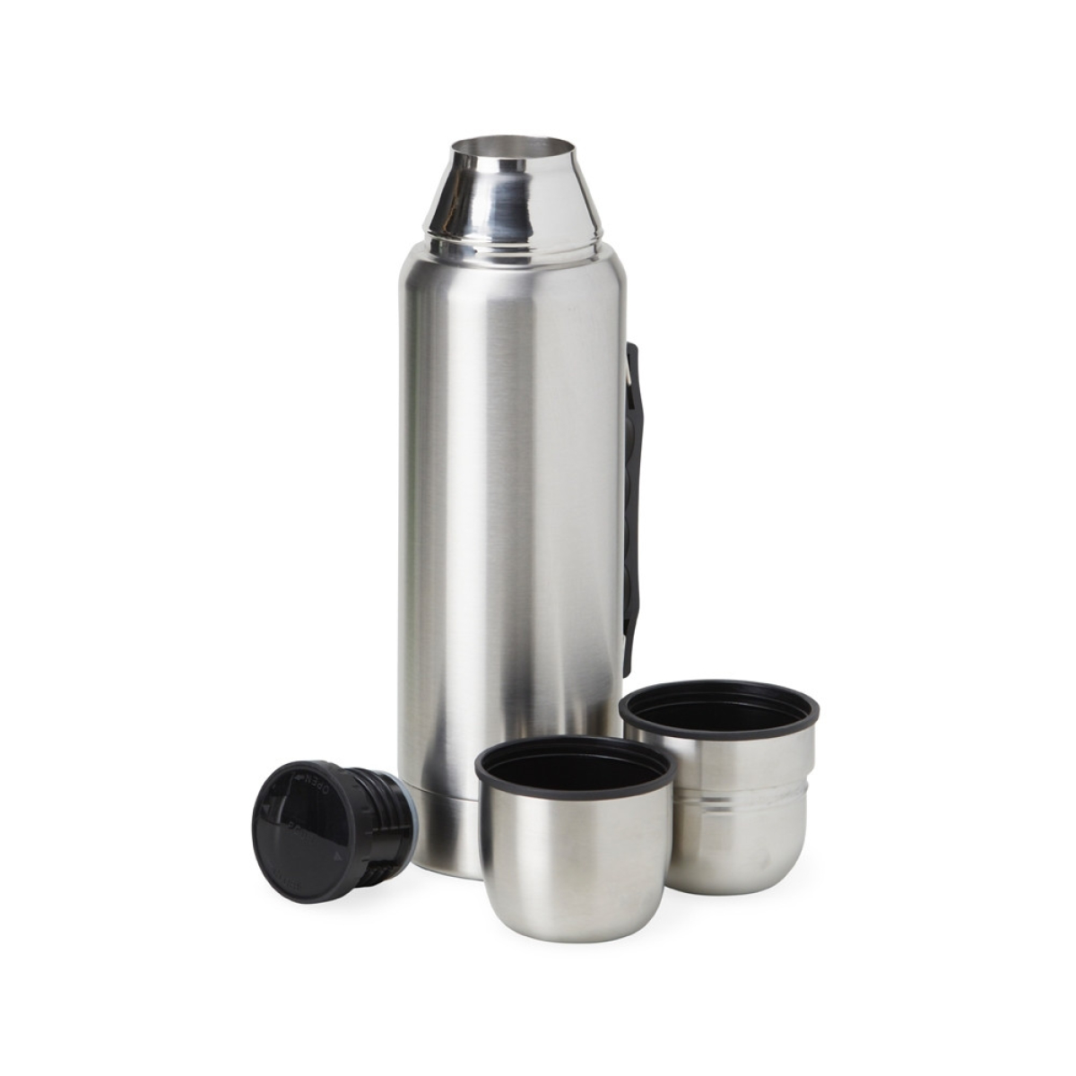 Descrição: Garrafa térmica de inox com parede dupla e tampa dupla, capacidade de 1 litro. Com alça plástica para transporte, a garrafa contém duas tampas utilizáveis como copos.