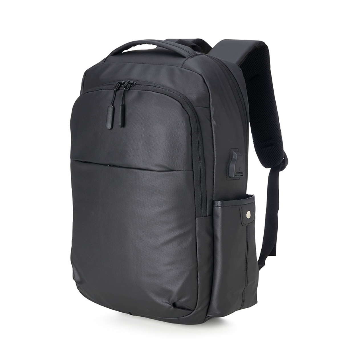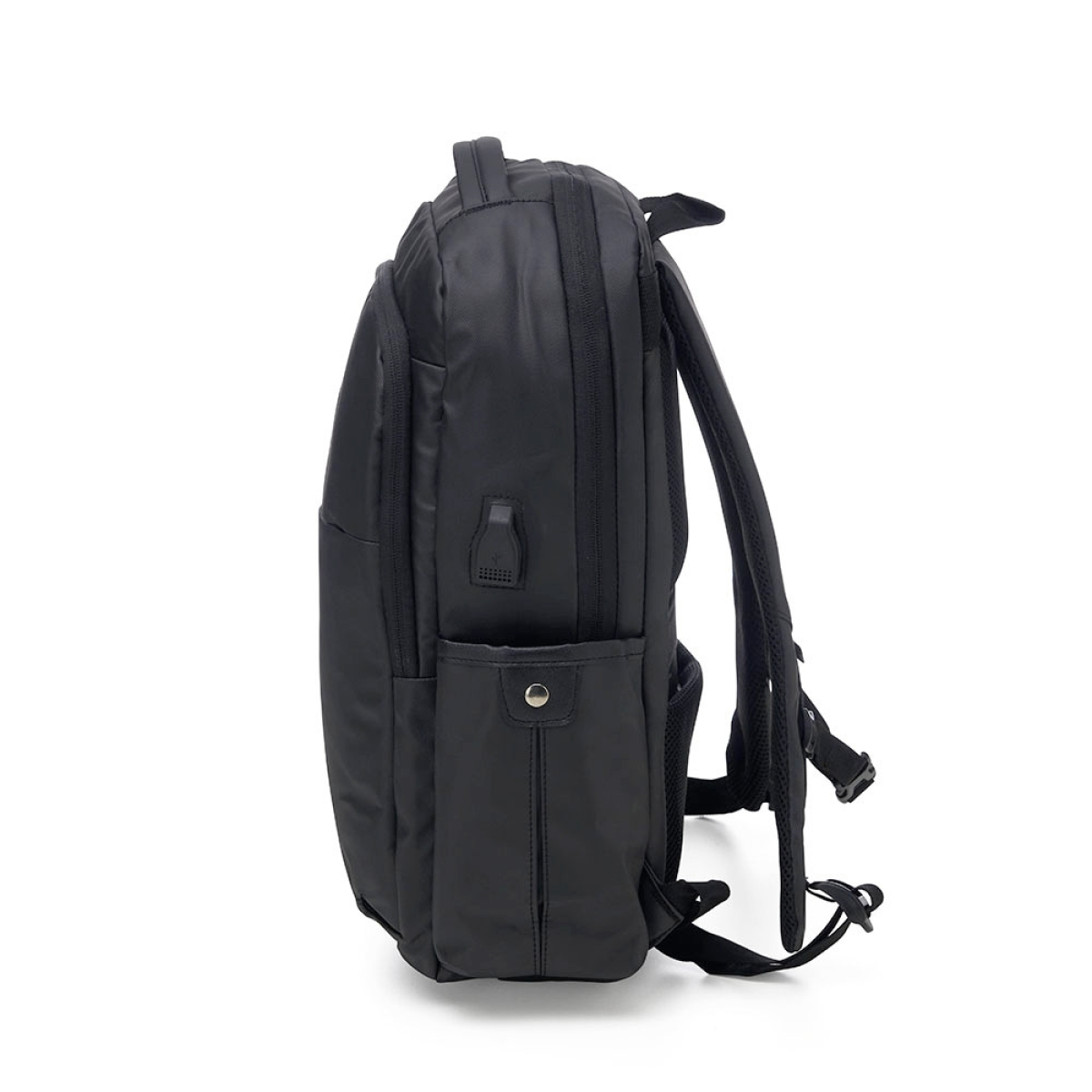 Descrição: Mochila em couro sintético 20 litros resistente à água com quatro compartimentos, sendo o principal com bolso para notebook até 14 e um exclusivo com proteção contra furto. Com divisórias internas para acessórios, a mochila possui bolsos laterais, suporte externo usb, duas alças de mãos, alça para encaixe em malas de viagem e área costada com revestimento espumado.