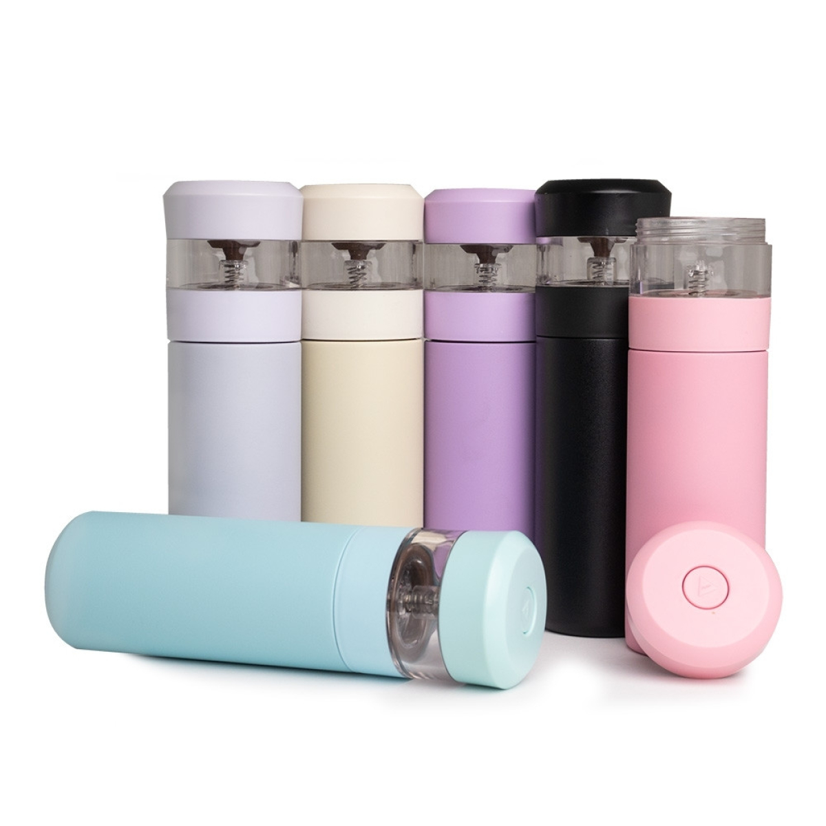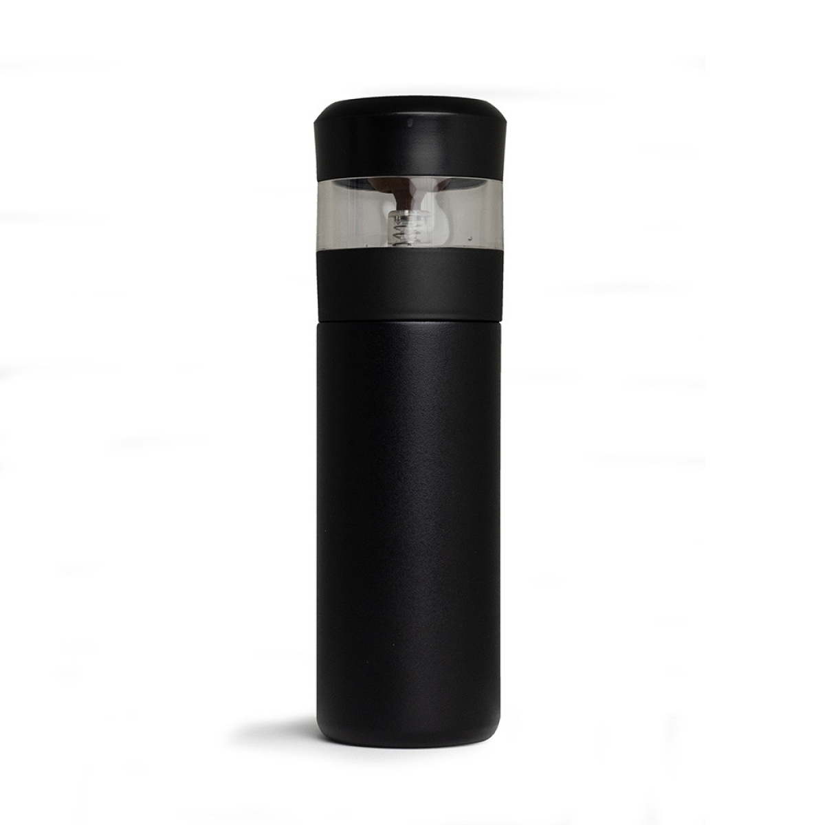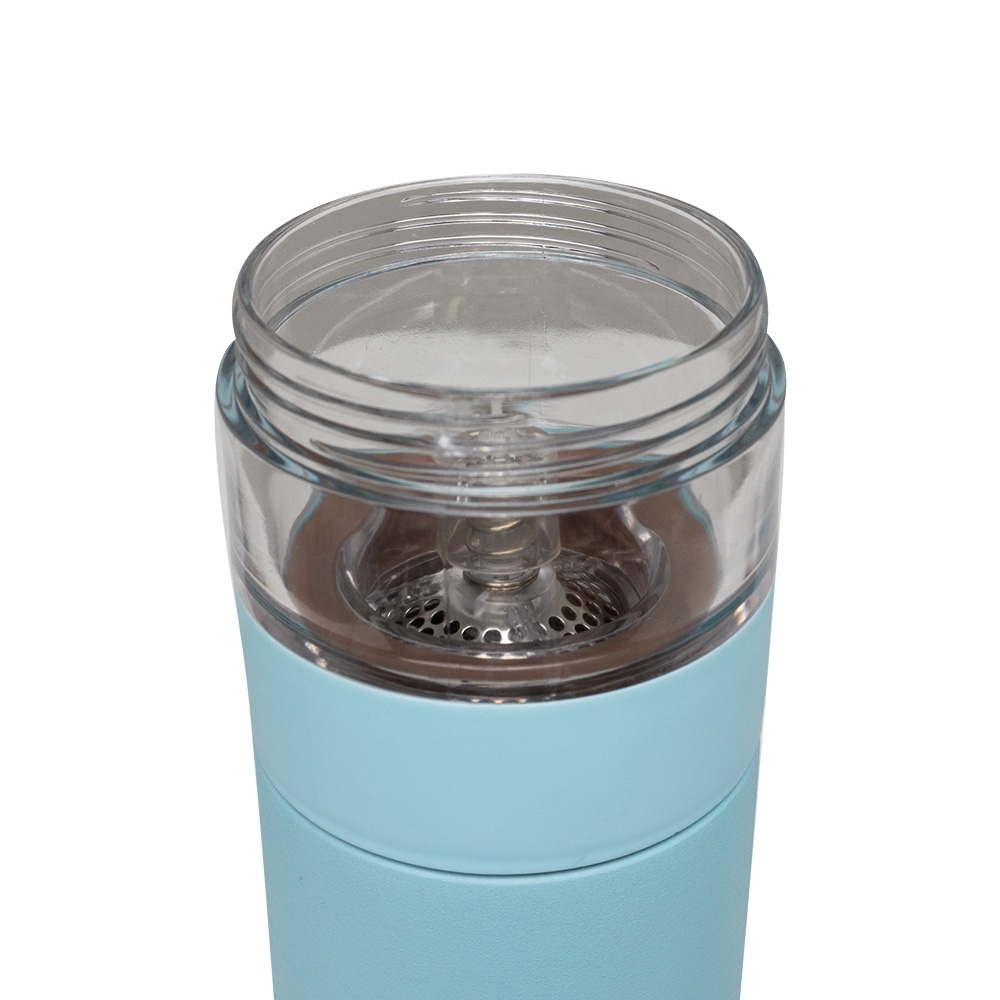Descrição: Garrafa térmica de 350ml feita em aço inoxidável 304. Possui compartimento separado com infusor integrado e botão na parte superior da tampa para acionar a liberação do líquido para o compartimento.