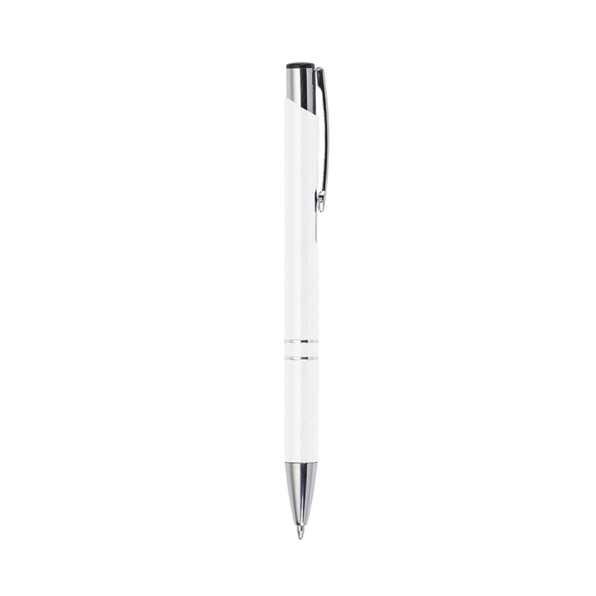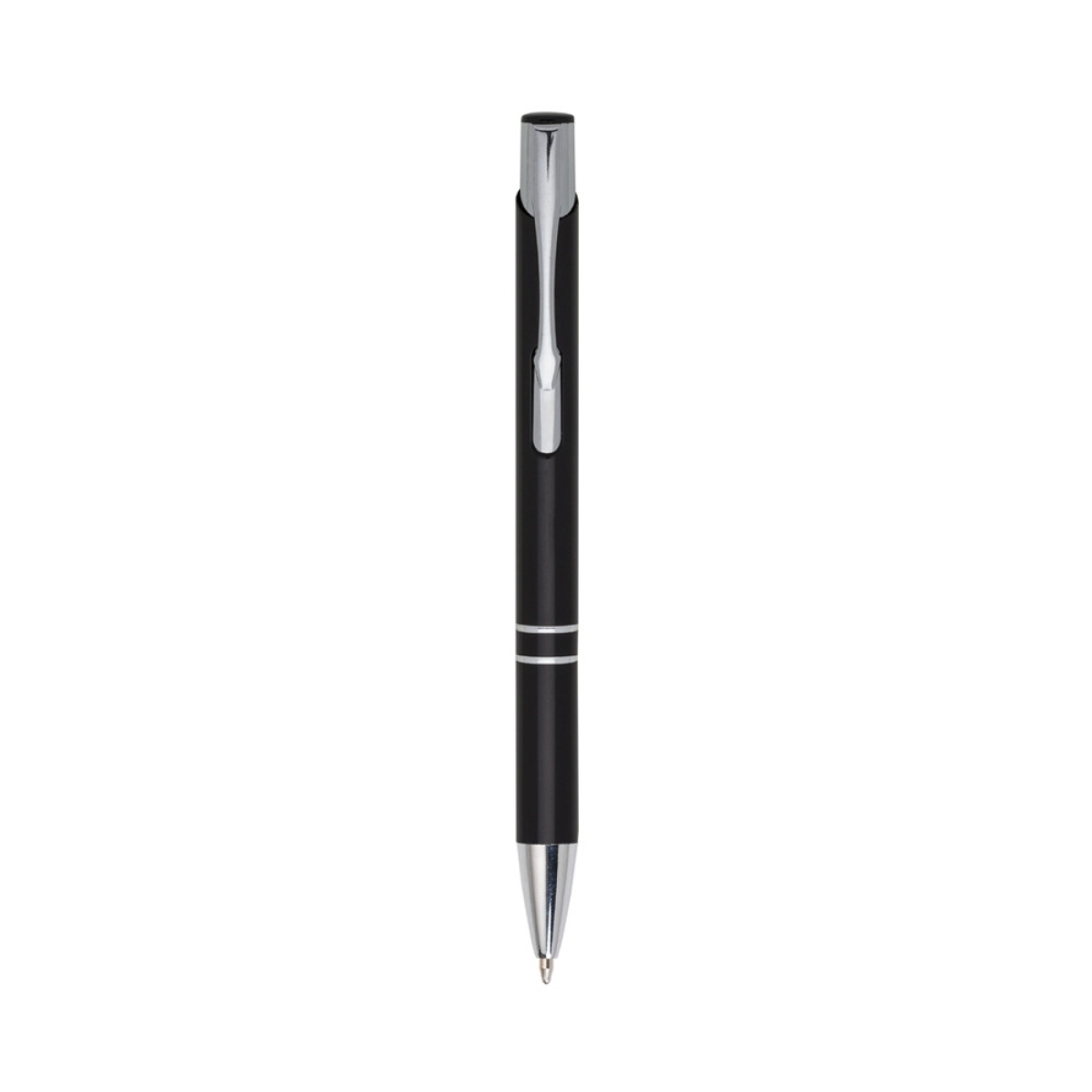 Descrição: Caneta metálica com carga esferográfica azul e acionamento por clique.