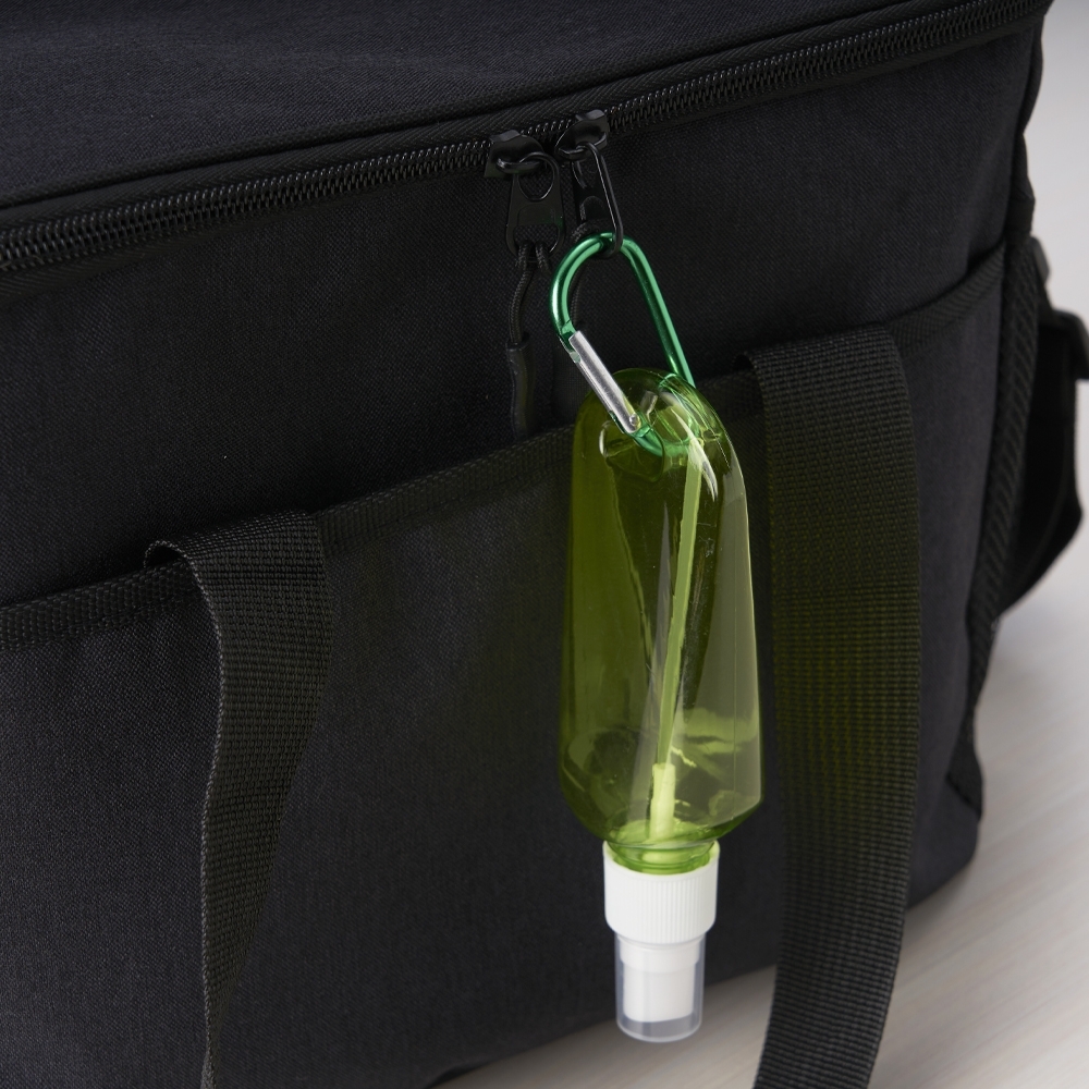 Descrição: Frasco plástico spray com capacidade de 100ml, contém tampa branca com encaixe rosqueável e acompanha chaveiro mosquetão para transporte.
