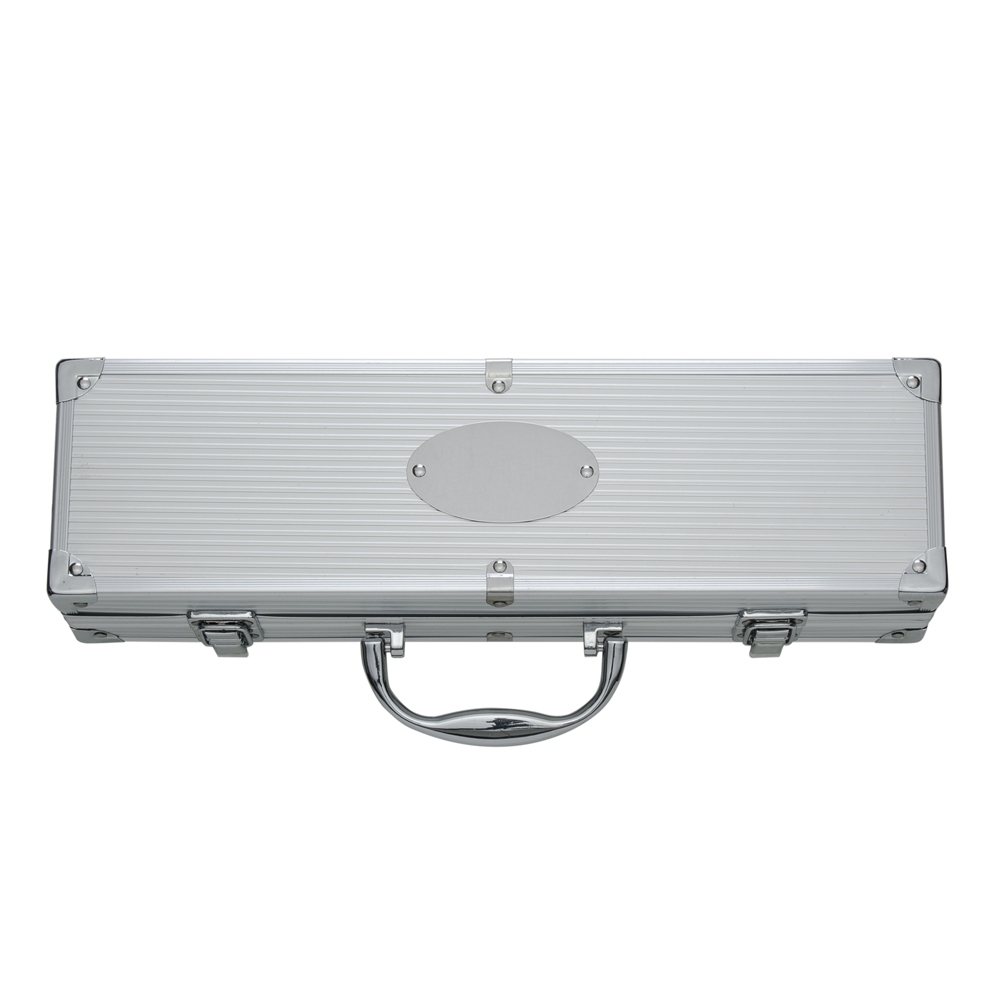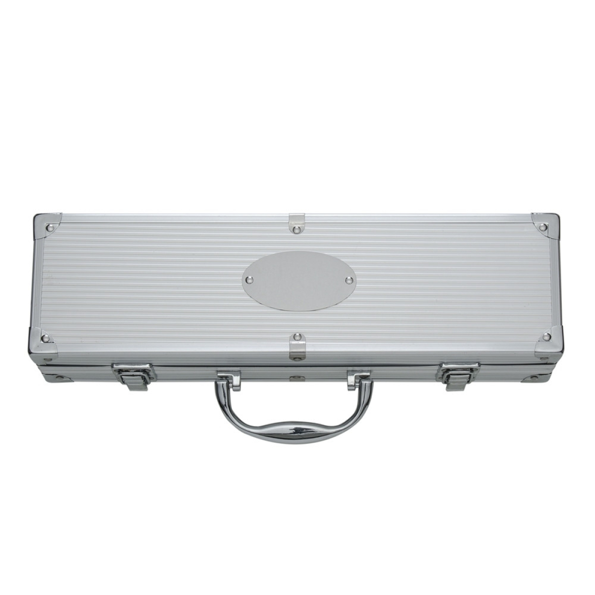Descrição: Kit churrasco 4 peças em maleta de alumínio com travas de segurança, contém: espátula, pegador, garfo e faca em inox. Parte interna da maleta com revestimento em tnt e suportes de velcro para fixação das peças.