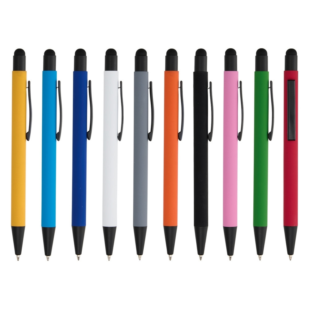 Descrição: Caneta metálica touchscreen com acabamento emborrachado, acionamento por clique e carga esferográfica azul 1.0mm.