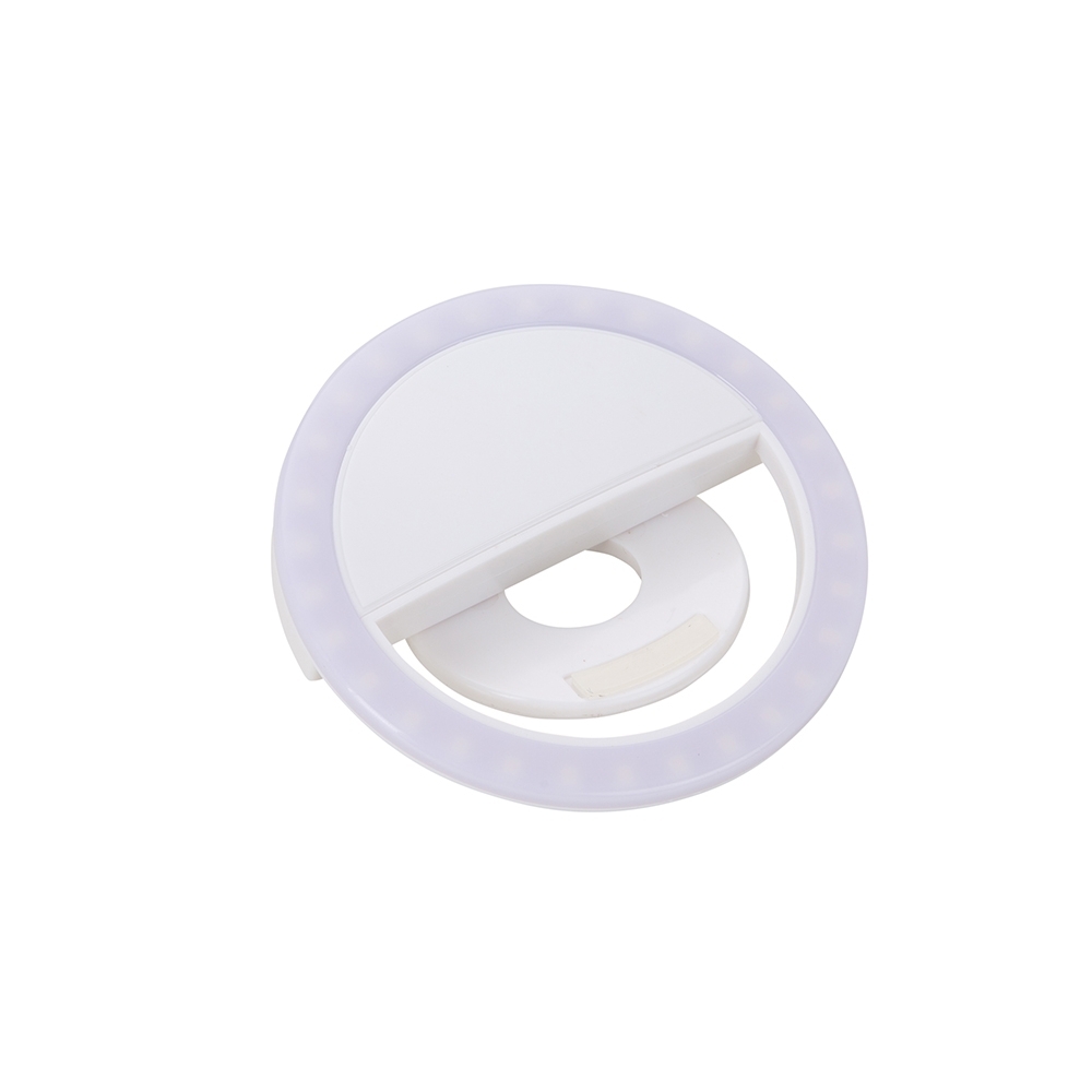 Descrição: Anel de iluminação para celular, utilizado para fotos em formato selfie. “Ring light” plástico no formato “presilha” para encaixe, possui três estágios de iluminação acionados pelo botão superior. Acompanha cabo USB para carregamento.
