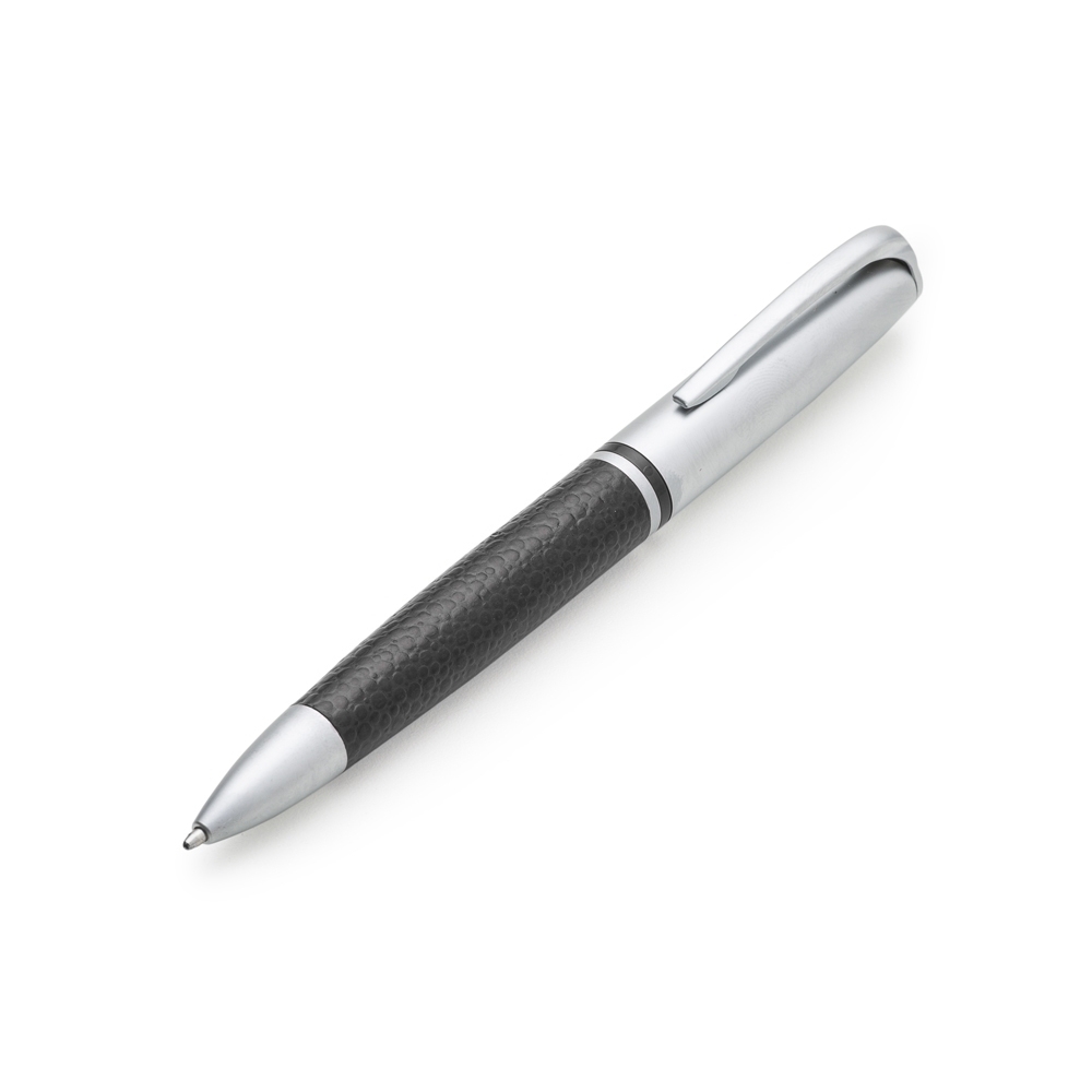 Descrição: Caneta metálica com detalhe em couro sintético, carga esferográfica azul e acionamento por rotação.