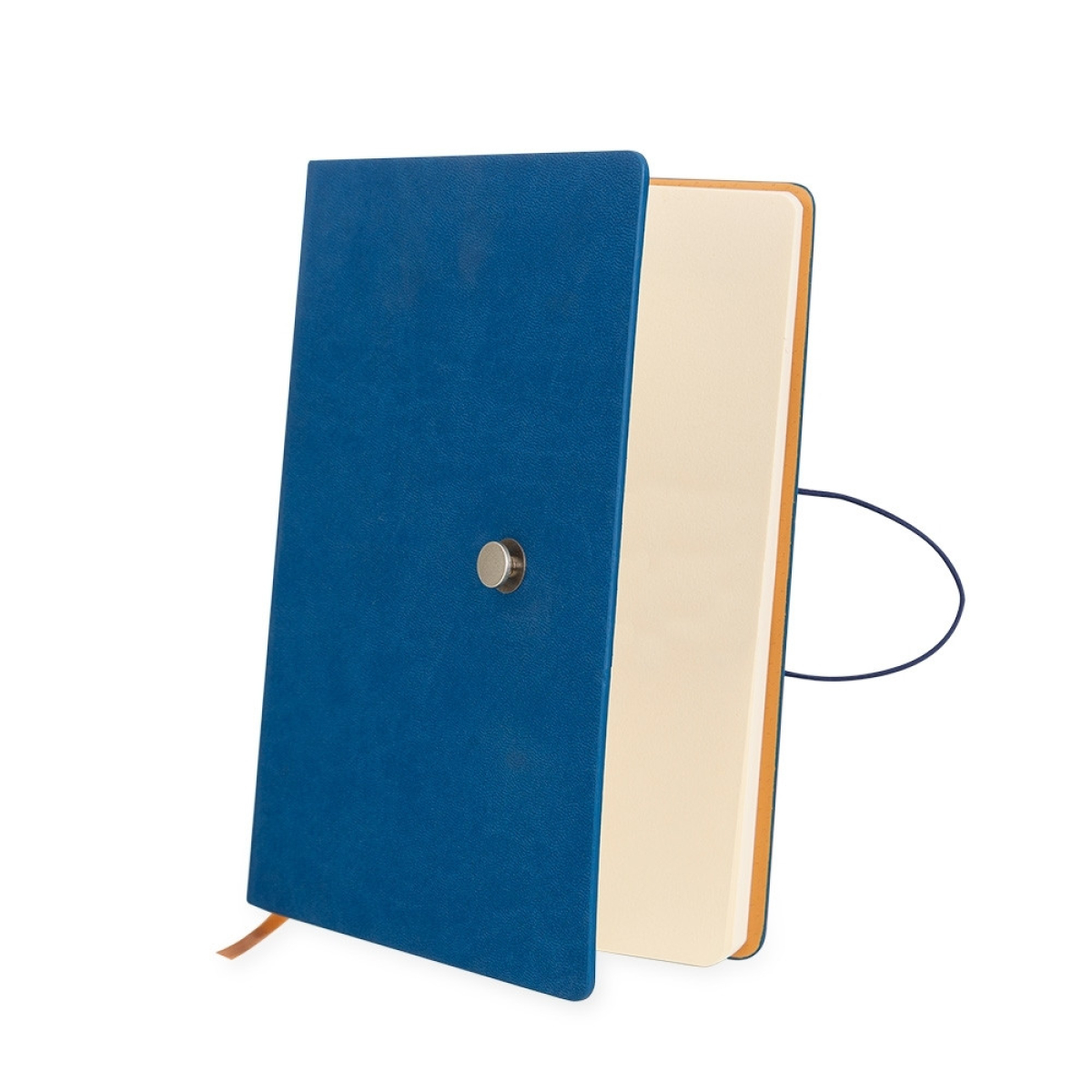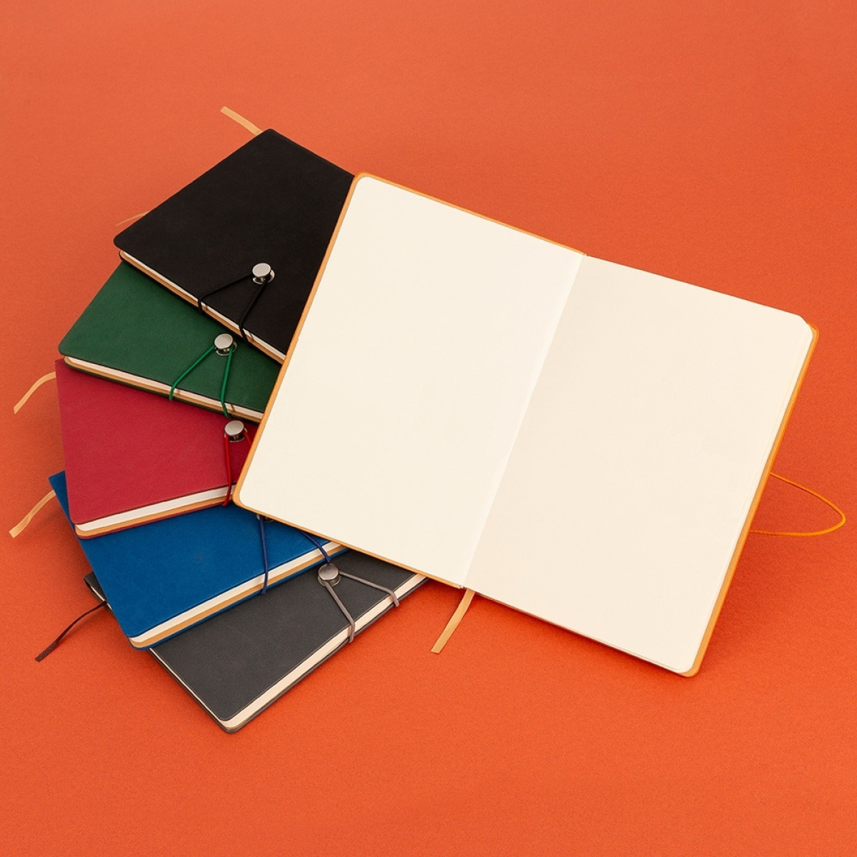 Descrição: Caderneta com fecho de pino e elástico de nylon para lacre. Capa em material sintético emborrachado, possui aproximadamente 96 folhas pardas pautadas e marca página em cetim.