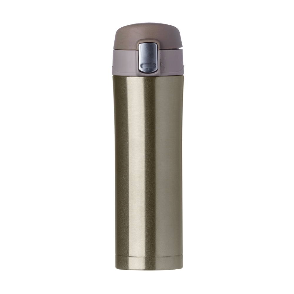 Descrição: Garrafa térmica de 450ml de metal inteira colorida com botão de abertura prata. Possui um sistema de trava com desenho indicativo de cadeados(aberto e fechado), ao levantar o botão pequeno basta pressionar o botão central maior para abrir a tampa(possui na parte interna borracha protetora evitando vazar o líquido). Para abrir a tampa por completo basta rosqueá-la, parte interna revestida em inox.