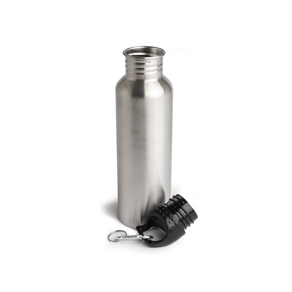 Descrição: Squeeze inox com capacidade para 800ml. Possui tampa rosqueável com aderência e uma alça para abri-la com mais conforto. Acompanha mosquetão.