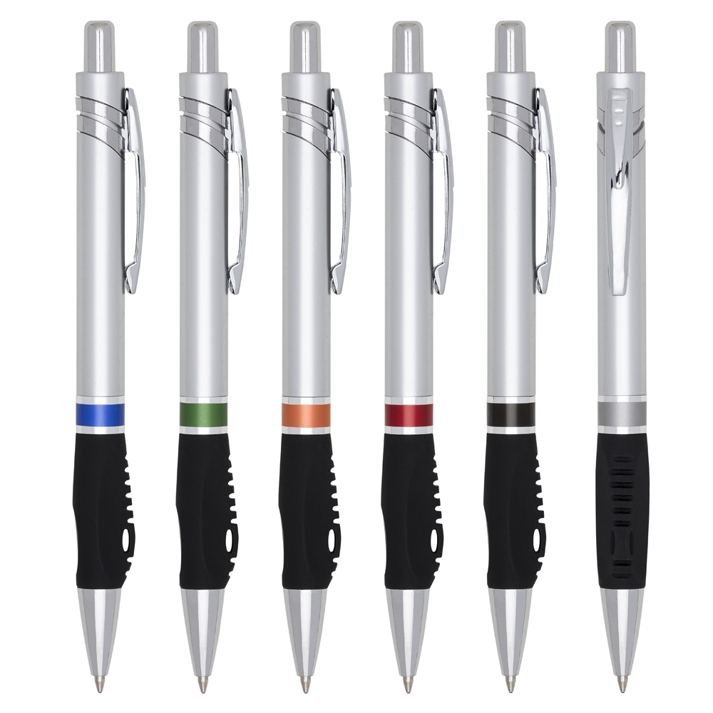 Descrição: Caneta plástica com detalhe emborrachado, carga esferográfica azul e acionamento por clique.